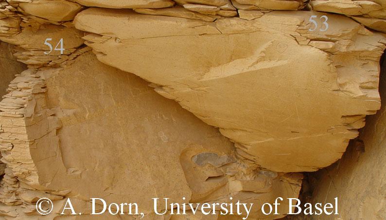 Graffito 54 befindet sich auf einer Felsfläche, Graffito 53 – das die Fortsetzung zu 54 darstellt – auf einer weiteren Felsfläche gleich rechts daneben. Zum Bezug der beiden Inschriften zu einander vgl. das Foto zu 54. Durch die Angaben zA=f "sein Sohn" in Graffito 53 bezieht es sich auf Graffito 54, in welchem der Vater Amunnacht genannt ist. Wahrscheinlich wurde es durch die genannten Söhne Ta, Pinodjem, Paneferemdjed und Chaemhedjet selbst geschrieben – entweder gleichzeitig oder später. Zur Klassifikation von solchen zu einer Inschrift hinzugefügten Graffiti als "follower"-Graffiti, vgl. die Literaturangabe. Die Zeichen der Graffiti sind alle klar lesbar, weshalb abweichend zum Faksimile keine Zerstörungen angegeben wurden. |